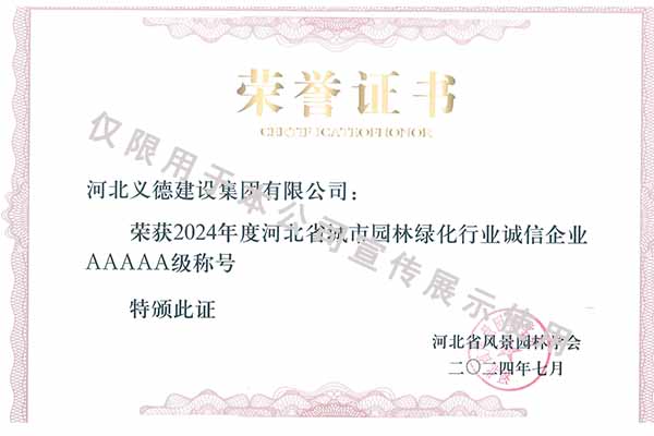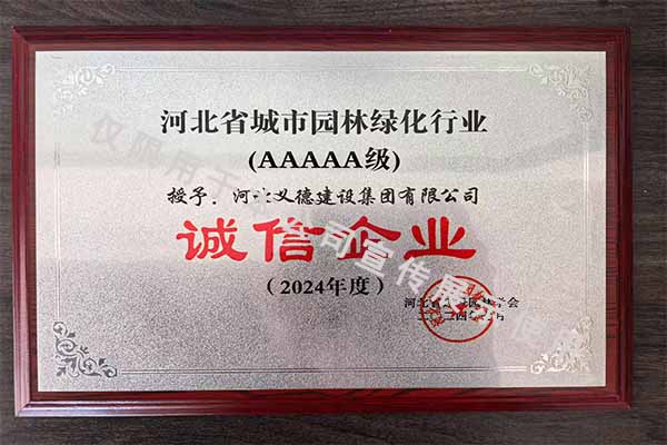 近年來,我公司始終秉持穩健經營、精益求精的發展理念,憑借扎實的綜合實力與良好的行業口碑屢獲認可,先后被授予河北省扶貧龍頭企業、國家林業標準化示范企業、2019年度全國苗圃50強、2018-2019年度河北省林業重點龍頭企業、保定市精品特色現代農業園區等稱號;在誠信經營與行業建設領域,更是接連獲得2019-2023年河北省建設工程招標投標誠實守信5A級施工企業、2019-2024年河北省城市園林綠化行業誠信5A級企業、2021-2023年河北省誠信企業、2021-2024年度河北省園林優秀企業、2023-2024年河北省風景園林學會先進集體及2025年度安國市“誠信企業”等多項榮譽,凸顯了公司在扶貧攻堅、林業標準化發展、工程施工及誠信經營等多方面的扎實基礎與優勢。